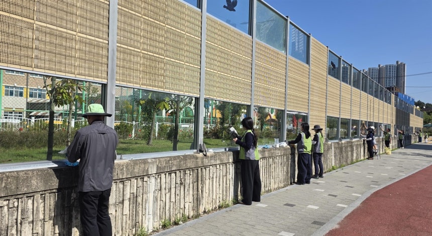 참가자들은 야생 조류 충돌 흔적이 발견된 방음벽 구간을 중심으로, 새들이 유리를 인식할 수 있도록 설계된 5×10 간격의 딱지를 직접 부착했다.